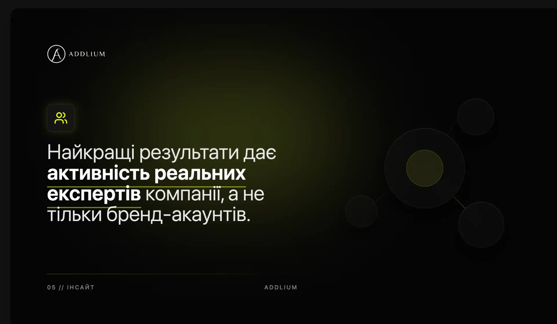 Тут ключову роль відіграє експертиза людей, а не рекламні кампанії. Потенційні клієнти знайомляться не стільки з брендом, скільки з конкретними експертами – керівниками, засновниками, консультантами або галузевими фахівцями.